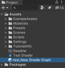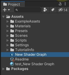 "Shader Graph 폴더" 아래에 Test Shader라고, 우리가 바꾼 이름으로 들어가 있습니다. 뭐야 왠 폴더가 있네요? 흠 이 폴더는 어디서 난거지??