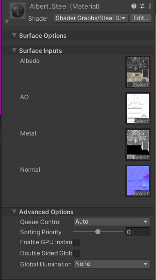 이렇게 스틸 셰이더그래프 하나 만들고 스틸 메터리얼에 적용시켜 주면 일단 나옵니다
