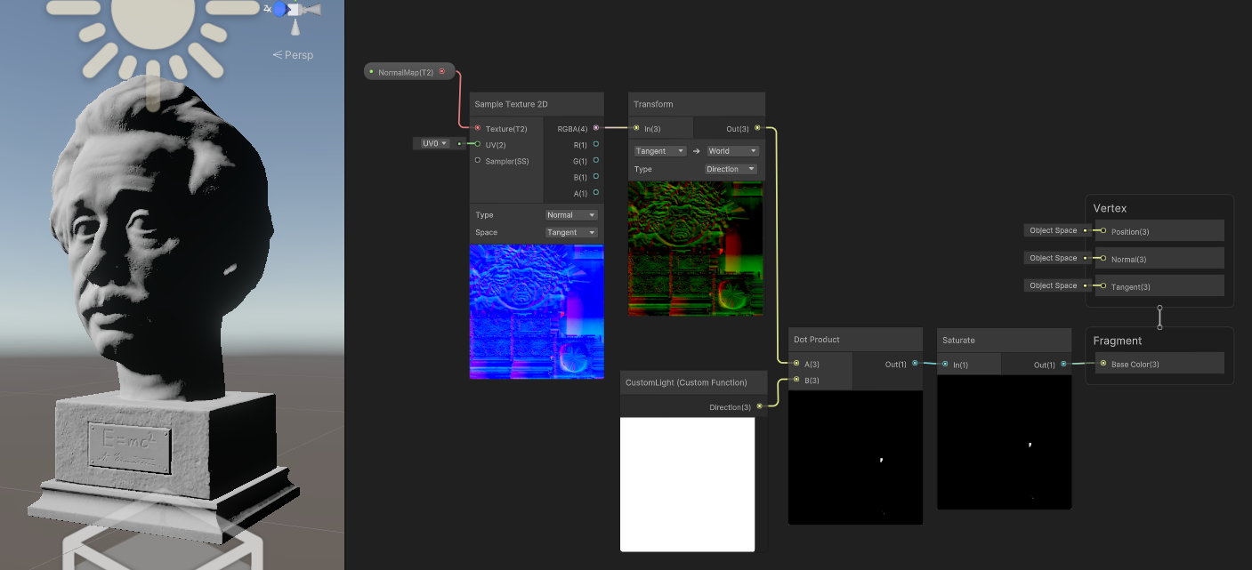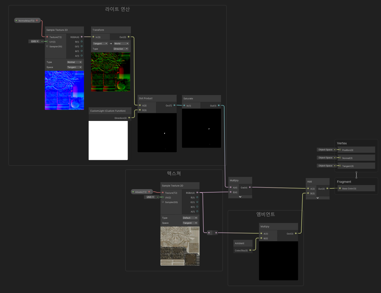 여하간, 이렇게 월드 좌표계로 변환한 노말맵을 라이트와 dot 연산 시켜주면 된다는 말입니다.