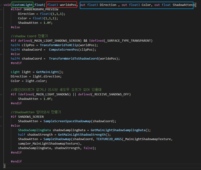 이렇게 CustomFunction.hlsl 파일에 써 넣어요. 잘 보시면 저번에 한 것에다가 셰도우 연산만 추가된 것입니다.