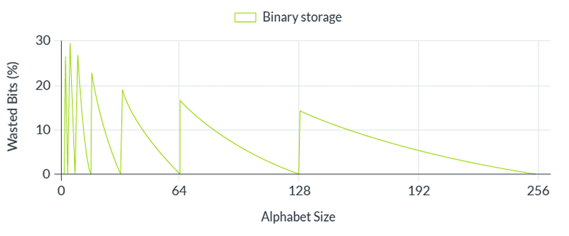 이 차트는 대부분의 알파벳 크기에 대해 문자당 정수 비트 수를 사용하면 많은 저장 용량을 낭비한다는 것을 보여줍니다. 효율성은 압축 형식에 매우 중요하므로 ASTC가 다루어야 했던 영역입니다.